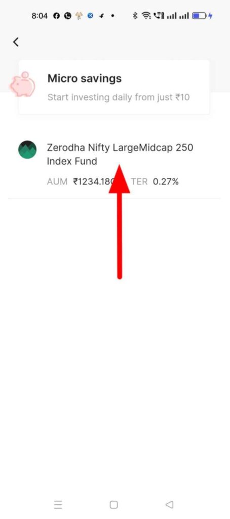 स्टेप 02: Micro Savings पर क्लिक करने के बाद एक नया पेज ओपन होगा यहाँ पर आपको Zerodha Nifty LargeMidcap 250 Index Fund लिखा हुआ दिखाई देगा, इस पर क्लिक करें।
