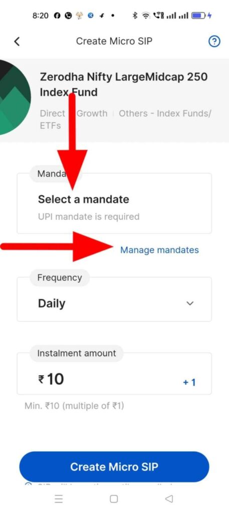 स्टेप 04: Create Micro SIP पर क्लिक करने के बाद नया पेज खुलेगा, यहाँ पर सबसे पहले Mandate वाले सेक्शन पर क्लिक करके अपने पहले से किए हुए मैंडेट को चुनना है। अगर आपने पहले से मैंडेट क्रिएट नहीं किया है तो आपको Manage Mandates पर क्लिक करके पहले Create Mandate की प्रोसेस को पूरा करना है।