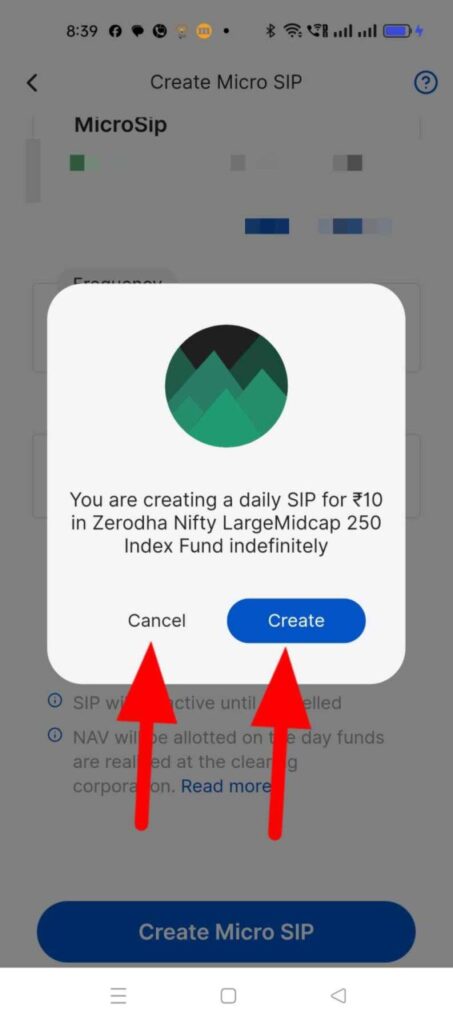 स्टेप 05: Create Micro SIP टैब पर क्लिक करते हैं, एक पॉप-अप शो होगा जहाँ लिखा होगा You are a daily SIP for ₹10 in Zerodha Nifty Large Midcap 250 Index Fund indefinitely, साथ ही cancel और create का विकल्प मिलेगा। आपको Create पर क्लिक करना है।