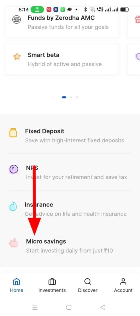 स्टेप 01: सबसे पहले Zerodha Coin App में यूजर ID और Password डालकर लॉगिन करें। लॉगिन के बाद जो पेज ओपन होगा उसमें नीचे की ओर आएं यहाँ आपको Micro savings लिखा हुआ दिखाई देगा आपको इसपर क्लिक करना है।